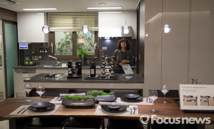 (서울=포커스뉴스) 20일 오전 서울 송파구 래미안 하우스에 개관한 래미안 과천 센트럴 스위트 견본주택을 찾은 시민이 전시된 주방을 살펴보고 있다.