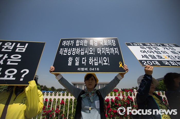 (서울=포커스뉴스) 4.16연대가 20일 오전 서울 여의도 국회 앞에서 19대 국회 세월호 특별법 개정 특검 무산에 대한 입장발표 기자회견 갖고 있다.