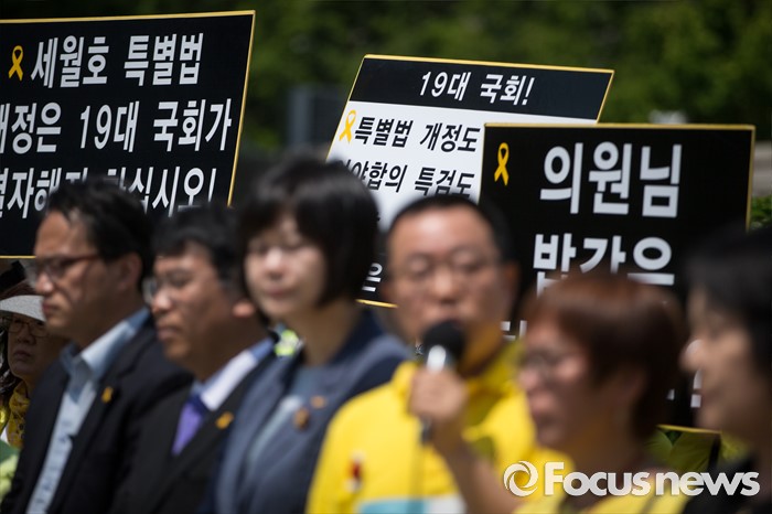(서울=포커스뉴스) 4.16연대가 20일 오전 서울 여의도 국회 앞에서 19대 국회 세월호 특별법 개정 특검 무산에 대한 입장발표 기자회견 갖고 있다.