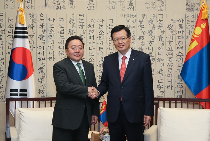 (서울=포커스뉴스) 정의화(오른쪽) 국회의장이 20일 오전 서울 여의도 국회 의장접견실에서 차히아 엘벡도르지(ELBEGDORJ Tsakhia) 몽골 대통령을 만나 양국간 우호 협력관계 증진 방안에 대해 논의하기 앞서 기념촬영을 하고 있다. <사진제공=국회>