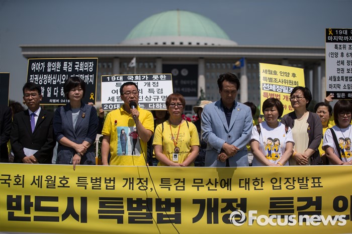 (서울=포커스뉴스) 4.16연대가 20일 오전 서울 여의도 국회 앞에서 19대 국회 세월호 특별법 개정 특검 무산에 대한 입장발표 기자회견 갖고 있다.