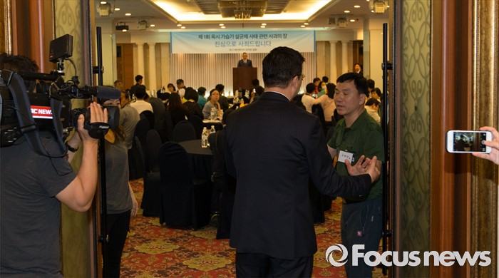 (대전=포커스뉴스) 아타 사프달 옥시레킷벤키저 대표와 임원진이 20일 오후 대전 유성구 아드리아호텔에서 옥시의 가습기 살균제 제품 피해자와 면담을 마련한 가운데 피해자들이 면담장으로 입장하고 있다.