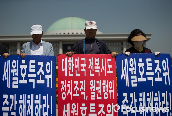 (서울=포커스뉴스) 한 보수 단체가 20일 오전 서울 여의도 국회 앞에서 세월호 특조위 해체를 촉구하는 시위를 하고 있다.