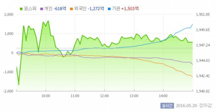 이날 코스피는 1943.84에서 장을 시작했다. 이후 지수는 약보합권에서 등락을 거듭했다. 그러나 기관이 장 중반 대규모 매수에 나서면서 강보합세로 마감했다.
