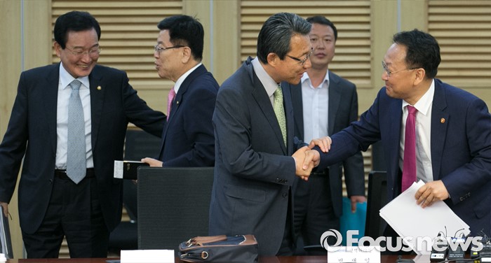 (서울=포커스뉴스) 20일 오후 서울 여의도 국회 의원회관에서 1차 민생경제 현안 점검회의를 마친 3당 정책위의장과 유일호 경제부총리 겸 기획재정부 장관이 취재진을 대상으로 결과 브리핑 후 악수하고 있다. 왼쪽부터 변재일 더불어민주당 정책위의장, 김광림 새누리당 정책위의장, 김성식 국민의당 정책위의장, 유 부총리.
