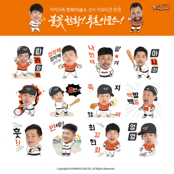 한화는 정근우, 이용규, 김태균, 김경언, 조인성 등 야수 6명과 권혁, 이태양, 박정진 등 투수 5명 등 총 13명에 대한 선수 이모티콘을 내놓았다. 야구 관련 표현 뿐 아니라 일상생활 모습 등 다양한 표현으로 제작됐다. 한화 구단은 "지난 4월 무표 배포한 마스코트 '수리 이모티콘' 5만개가 소진돼 팬 성원에 보답하고자 '선수 이모티콘'을 추가 출시하게됐다"고 설명했다.