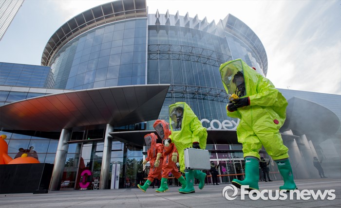 (서울=포커스뉴스) 20일 오후 서울 강남구 코엑스에서 열린 '2016 재난대응 안전한국훈련'에 참여한 훈련병력들이 테러대응훈련을 펼치고 있다.