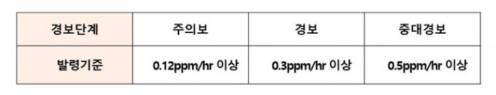 오존주의보는 오존의 1시간 평균 농도가 0.12ppm/hr 이상일 때 발령된다. 오존의 1시간 평균 농도가 0.3ppm/hr 이상인 경우에는 오존경보가 발령되며 0.5ppm/hr 이상이 되면 오존 중대경보가 발령된다.