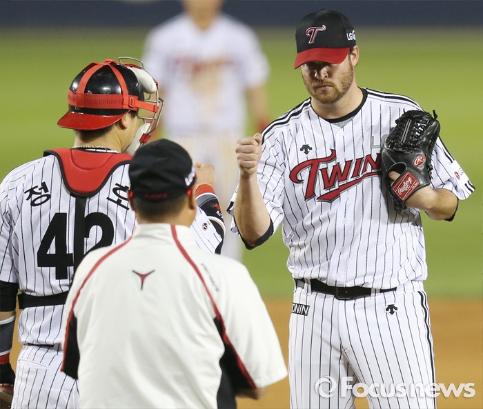 (서울=포커스뉴스) 20일 서울 잠실구장에서 열린 2016 프로야구 넥센-LG 경기 7회초 2사후 LG 선발투수 코프랜드가 투구수 110개를 채우고 교체되며 포수 정상호와 주먹을 무주치고 있다.