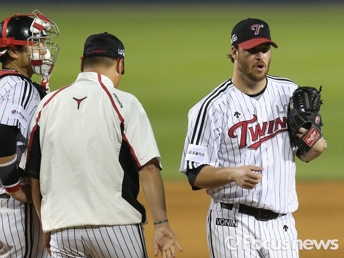 | △ 교체돼 마운드 내려가는 LG 코프랜드 |
