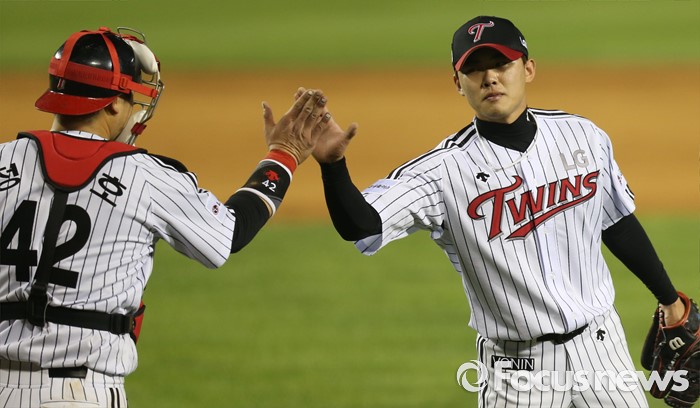 (서울=포커스뉴스) 20일 서울 잠실구장에서 열린 2016 프로야구 넥센-LG 경기에서 9회 등판해 LG 승리를 지킨 임정우와 포수 정상호가 하이파이브하며 승리의 기쁨을 나누고 있다.