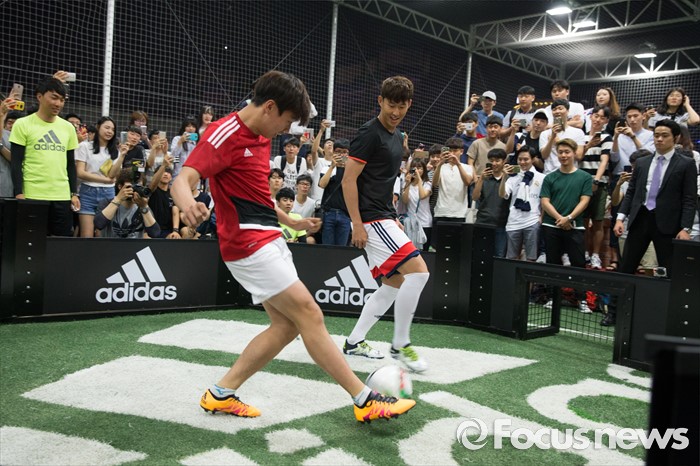 (서울=포커스뉴스) 손흥민이 20일 오후 서울 용산구 아이파크몰 풋살경기장에서 열린 아디다스 손흥민 팬미팅 및 사인회에서 팬들과 1대1 경기를 하고 있다.