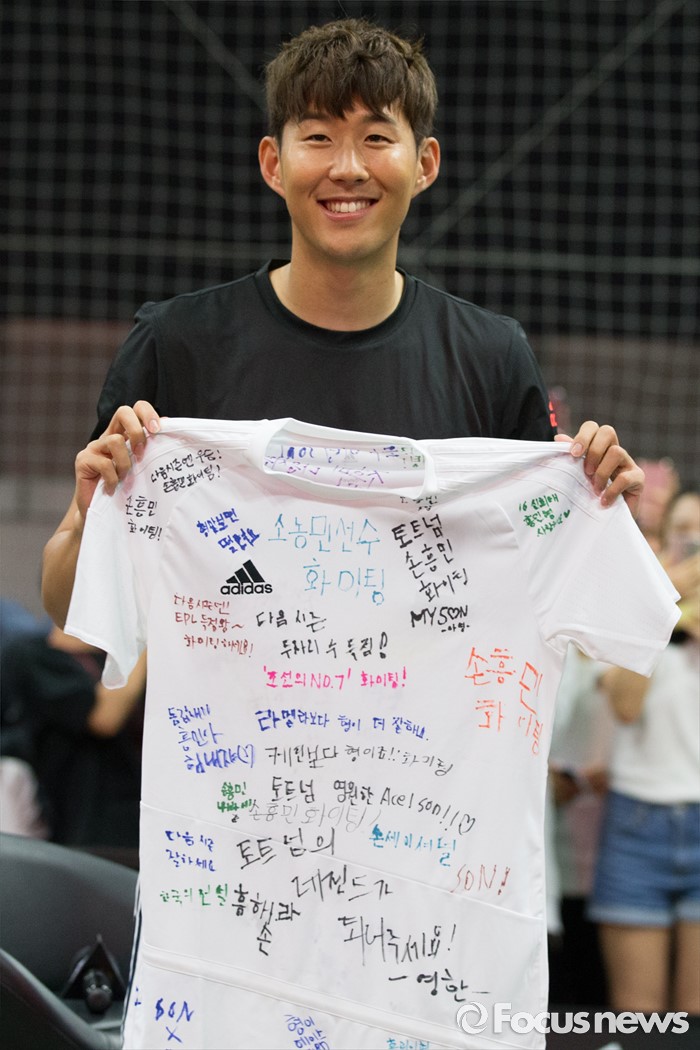(서울=포커스뉴스) 손흥민이 20일 오후 서울 용산구 아이파크몰 풋살경기장에서 열린 아디다스 손흥민 팬미팅 및 사인회에서 팬들의 메시지가 적인 티셔츠를 들고 있다.