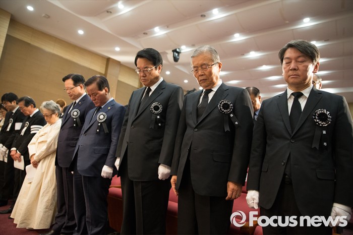 (서울=포커스뉴스) 21일 오전 서울 여의도 국회에서 엄수된 故 김재순 전 국회의장 국회장 영결식에 정의화(오른쪽 다섯번째부터) 국회의장, 정갑윤 국회부의장, 정진석 새누리당 원내대표, 김종인 비대위 대표, 안철수 국민의당 상임공동대표가 참석해 묵념을 하고 있다.