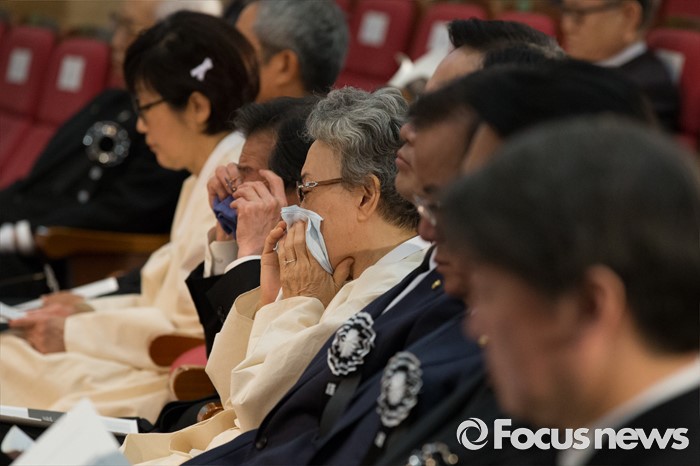 (서울=포커스뉴스) 21일 오전 서울 여의도 국회에서 엄수된 故 김재순 전 국회의장 국회장 영결식에 유가족들이 눈물을 흘리고 있다.