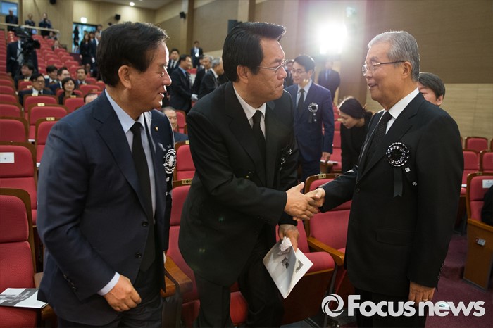(서울=포커스뉴스) 21일 오전 서울 여의도 국회에서 엄수된 故 김재순 전 국회의장 국회장 영결식에 정진석 새누리당 원내대표와 김종인 비대위 대표가 참석해 악수하고 있다. 왼쪽 정갑윤 국회부의장.