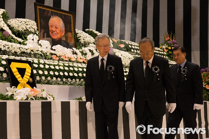 (서울=포커스뉴스) 21일 오전 서울 여의도 국회에서 엄수된 故 김재순 전 국회의장 국회장 영결식에 박희태(왼쪽부터) 전 국회의장, 박관용 전 국회의장, 강찬희 전 국회의장이 헌화 후 걸어나오고 있다.