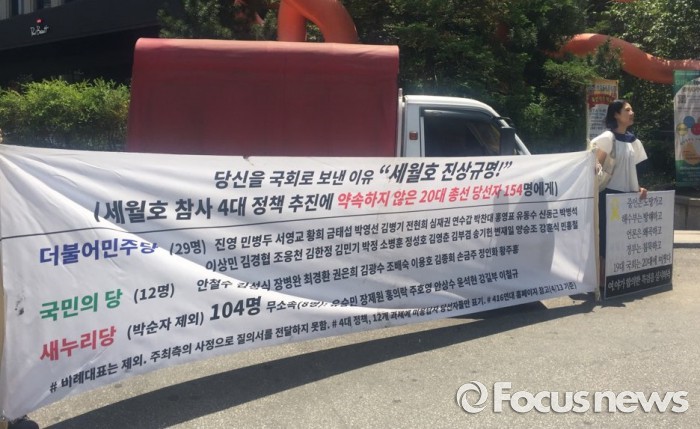 풀뿌리시민네트워크 등 시민사회단체는 21일 새누리당과 더불어민주당, 국민의당 당사 앞에서 세월호특별법 개정안 발의를 약속한 20대 총선 당선인 154명의 명단을 적은 펼침막을 들고 이들의 약속 이행을 촉구했다.