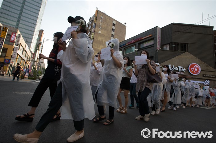 (서울=포커스뉴스) 21일 오후 서울 서초구 강남역 10번 출구 인근에서 시민들이 '강남역 여성혐오 살인사건 추모 집회'에 참석해 행진하고 있다.