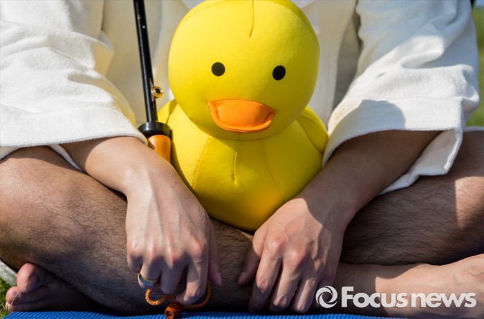 (서울=포커스뉴스) 22일 오후 서울 용산구 이촌 한강공원에서 열린 '한강 멍때리기 대회'에서 한 참가자가 오리인형을 들고 있다.