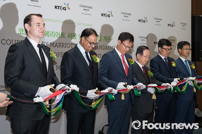 (서울=포커스뉴스) 23일 오전 서울 중구 코트야드 메리어트 서울 남대문 호텔에서 내빈들이 참석한 가운데 개관식이 열리고 있다. 왼쪽부터 폴 캐닝스 코트야드 메리어트 서울 남대문 총지배인, 라지브 메논 메리어트 인터내셔널 최고운영책임자, 백복인 KT&G 사장, 최경원 사외이사, 김용필 노조위원장, 김흥렬 부사장.