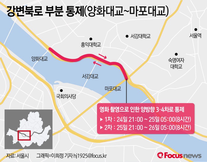(서울=포커스뉴스) 서울시는 오는 24일과 25일 오후 9시부터 다음날 오전 5시까지 각 8시간씩 강변북로 양화대교~마포대교 구간 양방향 3, 4차로를 부분 통제한다고 23일 밝혔다.