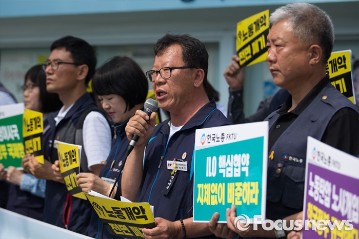 (서울=포커스뉴스) 23일 오전 서울 종로구 정부서울청사 앞에서 열린 한국정부의 불법지침과 사업장 시행 강행에 대한 ILO 제소 양대노총 기자회견에 참석한 최종진(가운데) 민주노총 위원장 직무대행이 모두발언을 하고 있다.