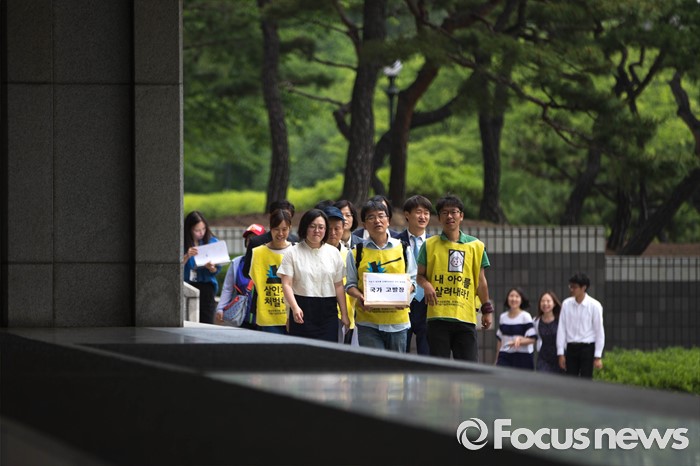 (서울=포커스뉴스) 23일 오전 서울 서초구 서울중앙지검 앞에서 가습기 살균제 피해자와 가족모임 관계자들이 기자회견을 열고 유해독성물질을 승인‧방치한 국가를 상대로 법정소송에 돌입할 것을 밝히고 있다. 피고발인은 강현욱·김명자 전 환경부 장관과 가습기 살균제 성분들이 승인될 당시 환경부 환경보건관리과 국장·과장 등 실무진 6명 이다.