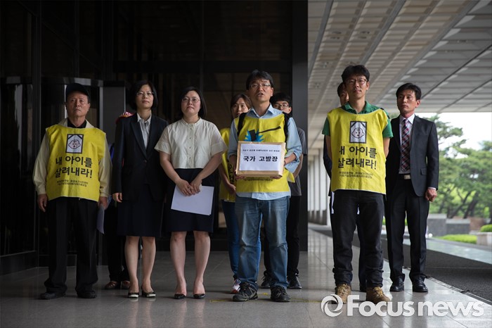 (서울=포커스뉴스) 23일 오전 서울 서초구 서울중앙지검 앞에서 가습기 살균제 피해자와 가족모임 관계자들이 기자회견을 열고 유해독성물질을 승인‧방치한 국가를 상대로 법정소송에 돌입할 것을 밝히고 있다. 피고발인은 강현욱·김명자 전 환경부 장관과 가습기 살균제 성분들이 승인될 당시 환경부 환경보건관리과 국장·과장 등 실무진 6명 이다.