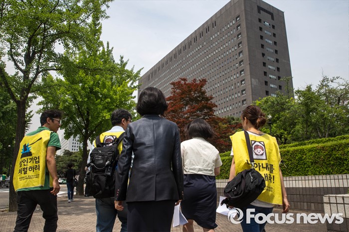 (서울=포커스뉴스) 23일 오전 서울 서초구 서울중앙지검 앞에서 가습기 살균제 피해자와 가족모임 관계자들이 기자회견을 열고 유해독성물질을 승인‧방치한 국가를 상대로 법정소송에 돌입할 것을 밝히고 있다. 피고발인은 강현욱·김명자 전 환경부 장관과 가습기 살균제 성분들이 승인될 당시 환경부 환경보건관리과 국장·과장 등 실무진 6명 이다.