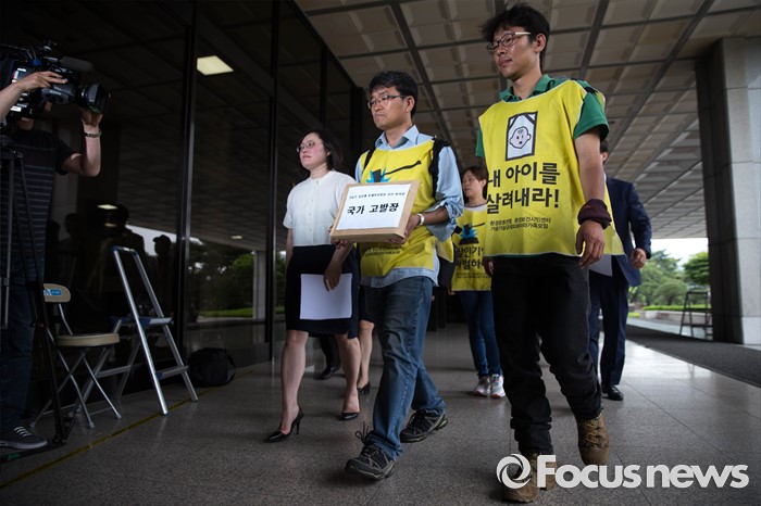 (서울=포커스뉴스) 23일 오전 서울 서초구 서울중앙지검 앞에서 가습기 살균제 피해자와 가족모임 관계자들이 기자회견을 열고 유해독성물질을 승인‧방치한 국가를 상대로 법정소송에 돌입할 것을 밝히고 있다. 피고발인은 강현욱·김명자 전 환경부 장관과 가습기 살균제 성분들이 승인될 당시 환경부 환경보건관리과 국장·과장 등 실무진 6명 이다.