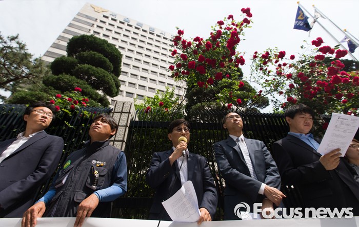 (서울=포커스뉴스) 민주사회를 위한 변호사모임 소속 강문대(가운데) 노동위원장 변호사가 23일 오전 서울 종로구 서울지방경찰청 앞에서 현대자동차 양재동 사옥 앞 집회에 대한 경찰의 위법한 공권력 행사 규탄 기자회견 중 모두발언 하고 있다.