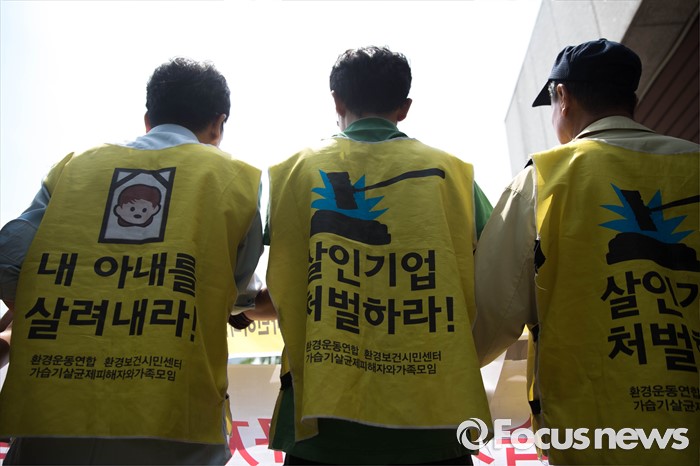 (서울=포커스뉴스) 23일 오전 서울 서초구 서울중앙지검 앞에서 가습기 살균제 피해자와 가족모임 관계자들이 기자회견을 열고 유해독성물질을 승인‧방치한 국가를 상대로 법정소송에 돌입할 것을 밝히고 있다. 피고발인은 강현욱·김명자 전 환경부 장관과 가습기 살균제 성분들이 승인될 당시 환경부 환경보건관리과 국장·과장 등 실무진 6명 이다.