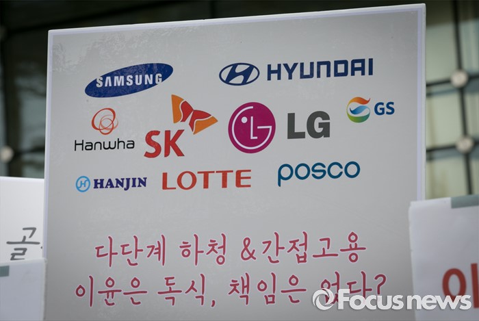 (서울=포커스뉴스) 23일 오전 서울 여의도 전국경제인연합회 앞에서 민주노총과 시민사회단체 등으로 구성된 재벌책임공동행동이 전경련 규탄 및 서울대행진 출발 기자회견을 하고 있다.