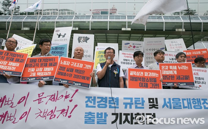 (서울=포커스뉴스) 23일 오전 서울 여의도 전국경제인연합회 앞에서 민주노총과 시민사회단체 등으로 구성된 재벌책임공동행동이 전경련 규탄 및 서울대행진 출발 기자회견을 하고 있다.