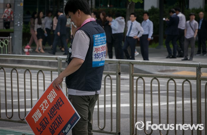(서울=포커스뉴스) 23일 오전 서울 여의도 전국경제인연합회 앞에서 민주노총과 시민사회단체 등으로 구성된 재벌책임공동행동의 한 참가자가 전경련 규탄 및 서울대행진 출발 기자회견을 마친 뒤 산업은행으로 이동하던 중 통화를 하고 있다.