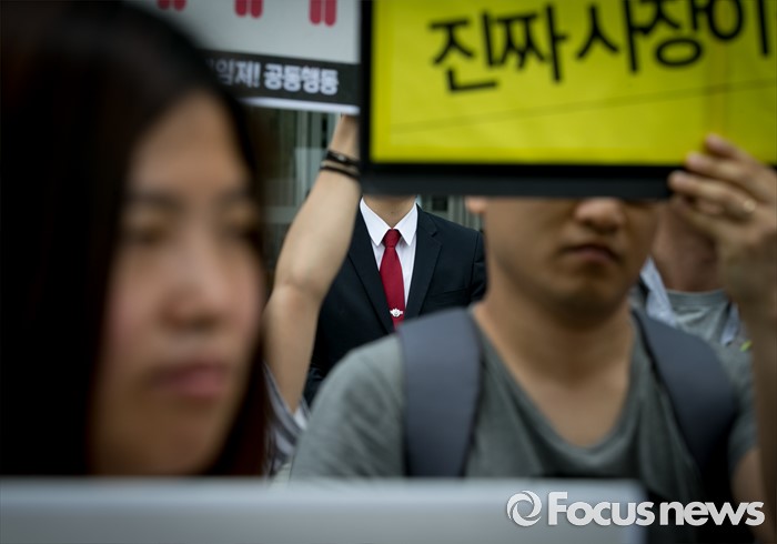 (서울=포커스뉴스) 23일 오전 서울 여의도 전국경제인연합회 앞에서 관계자들이 민주노총과 시민사회단체 등으로 구성된 재벌책임공동행동의 전경련 규탄 및 서울대행진 출발 기자회견을 지켜보고 있다.