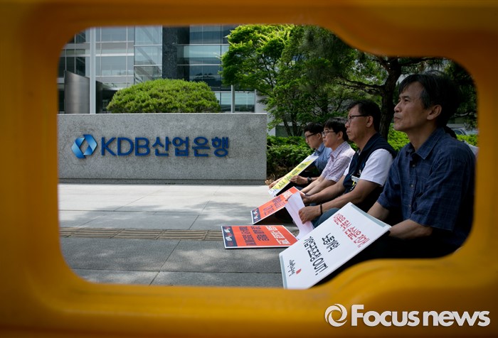 (서울=포커스뉴스) 23일 오후 서울 여의도 산업은행 본점 앞에서 민주노총과 시민사회단체 등으로 구성된 재벌책임공동행동이 규탄 및 서울대행진 출발 기자회견을 하고 있다.
