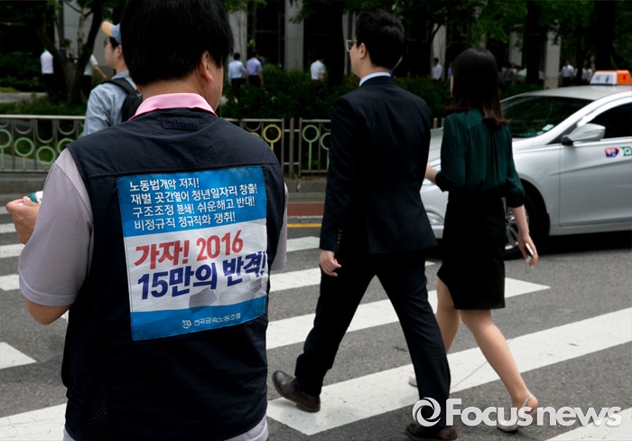 (서울=포커스뉴스) 23일 오전 서울 여의도 전국경제인연합회 앞에서 민주노총과 시민사회단체 등으로 구성된 재벌책임공동행동이 전경련 규탄 및 서울대행진 출발 기자회견을 마친 뒤 산업은행으로 이동하고 있다.