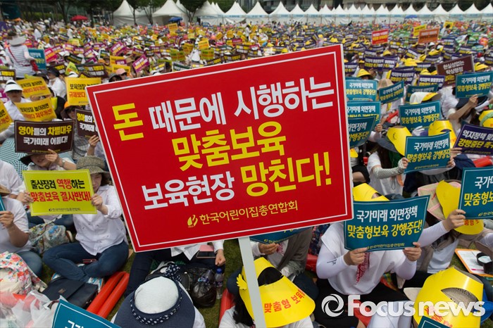 (서울=포커스뉴스) 23일 오후 서울 중구 시청광장에서 보육관계자들이 '어린이집 0~2세 맞춤형 보육제도 개선 및 시행 연기'를 촉구하며 결의대회를 하고 있다.
