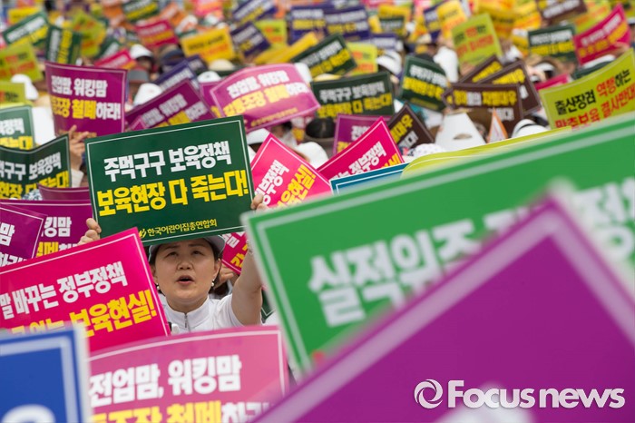 (서울=포커스뉴스) 23일 오후 서울 중구 시청광장에서 보육관계자들이 '어린이집 0~2세 맞춤형보육 제도개선 및 시행 연기'를 촉구하며 결의대회를 하고 있다.