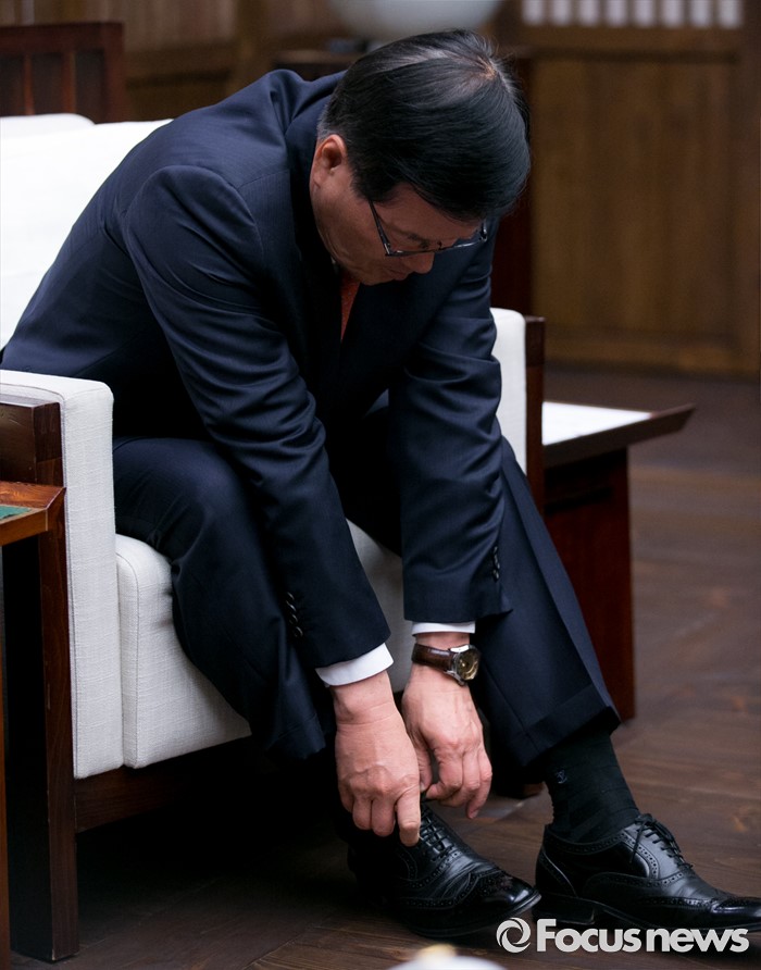 (서울=포커스뉴스) 싱크탱크 '새 한국의 비전'을 준비 중인 정의화 국회의장이 23일 오후 서울 여의도 국회에서 류치바오 중국 공산당 중앙선전부장을 접견, 면담 중 구두끈을 묶고 있다. 정 의장은 지난 19일 본회의를 마친 뒤 유승민 무소속 의원과 독대한 것으로 알려져 관심을 모으고 있다.