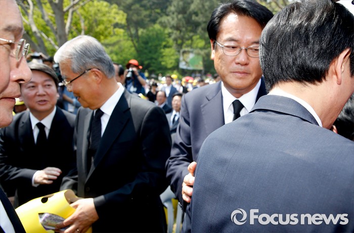 (김해=포커스뉴스) 23일 오후 경남 김해 봉하마을에서 엄수된 故 노무현 전 대통령 서거 7주기 추도식에 참석한 정진석(오른쪽 두번째부터) 새누리당 원내대표와 김종인 더불어민주당 비대위 대표, 안철수 국민의당 상임공동대표가 각각 인사하고 있다.