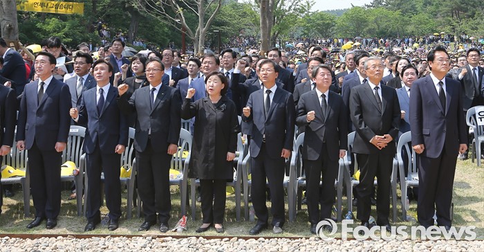(김해=포커스뉴스) 23일 오후 경남 김해 봉하마을에서 엄수된 故 노무현 전 대통령 서거 7주기 추도식에 참석한 내빈들이 임을 위한 행진곡을 부르고 있다. 앞줄 왼쪽부터 현기환 청와대 정무수석, 김민석 민주당 대표, 나경채 정의당 공동대표, 심상정 상임대표, 천정배 국민의당 공동대표, 안철수 상임공동대표, 김종인 더불어민주당 비대위 대표, 정진석 새누리당 원내대표.
