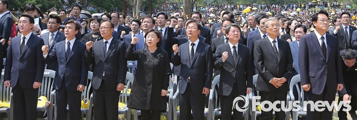 (김해=포커스뉴스) 23일 오후 경남 김해 봉하마을에서 엄수된 故 노무현 전 대통령 서거 7주기 추도식에 참석한 내빈들이 임을 위한 행진곡을 부르고 있다. 앞줄 왼쪽부터 현기환 청와대 정무수석, 김민석 민주당 대표, 나경채 정의당 공동대표, 심상정 상임대표, 천정배 국민의당 공동대표, 안철수 상임공동대표, 김종인 더불어민주당 비대위 대표, 정진석 새누리당 원내대표.
