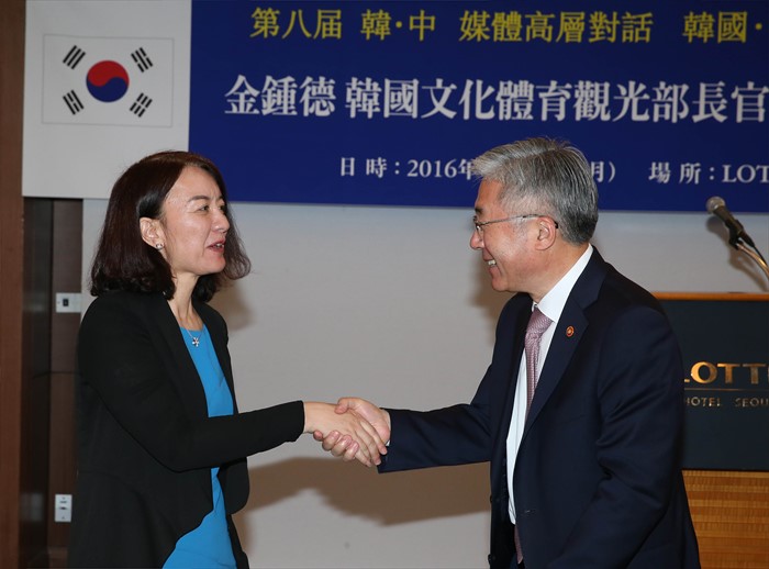 (서울=포커스뉴스) 23일 서울 중구 롯데호텔에서 문화체육관광부와 중국 국무원신문판공실이 주최하고21세기 한중교류협회가 주관하는 제8차 한중 고위언론인 포럼개회식이 열렸다. 김종덕(오른쪽) 문체부 장관이 노신녕 인민일보 부총편집장과 인사를 하고 있다. <사진제공=문화체육관광부>