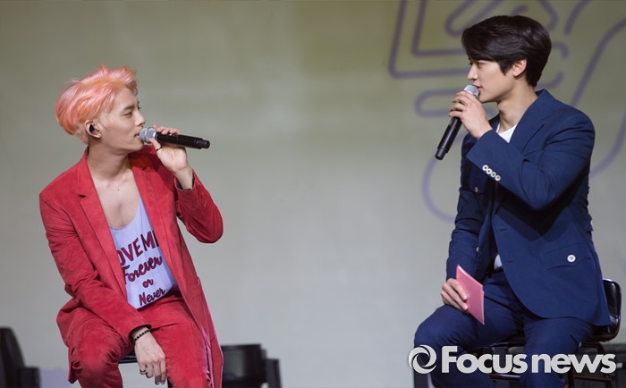 (서울=포커스뉴스) 23일 오후 서울 강남구 플래툰 쿤스트할레에서 열린 가수 종현의 정규 1집 앨범 '좋아'를 발표 쇼케이스에 참석한 가수 종현(왼쪽)과 민호가 인사를 나누고 있다.