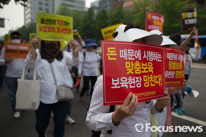 (서울=포커스뉴스) 23일 오후 서울 중구 시청광장 인근에서 보육관계자들이 '어린이집 0~2세 맞춤형보육 제도개선 및 시행 연기'를 촉구하며 가두행진을 하고 있다.