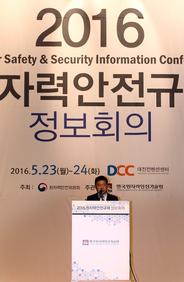 (대전=포커스뉴스) 김용환 원자력안전위원회 위원장이 23일 대전 컨벤션센터에서 열린 2016원자력안전규제정보회의에 참석해 축사를 하고 있다. <사진제공=원자력안전위원회>