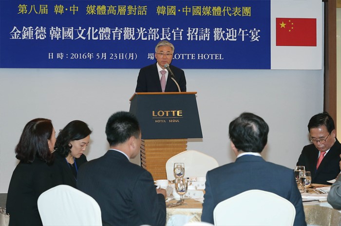 (서울=포커스뉴스) 23일 서울 중구 롯데호텔에서 문화체육관광부와 중국 국무원신문판공실이 주최하고21세기 한중교류협회가 주관하는 제8차 한중 고위언론인 포럼 개회식이 열렸다. 이날 김종덕 문체부 장관이 문화체육관광부 주최 환영 오찬에서 환영사를 하고 있다. <사진제공=문화체육관광부>
